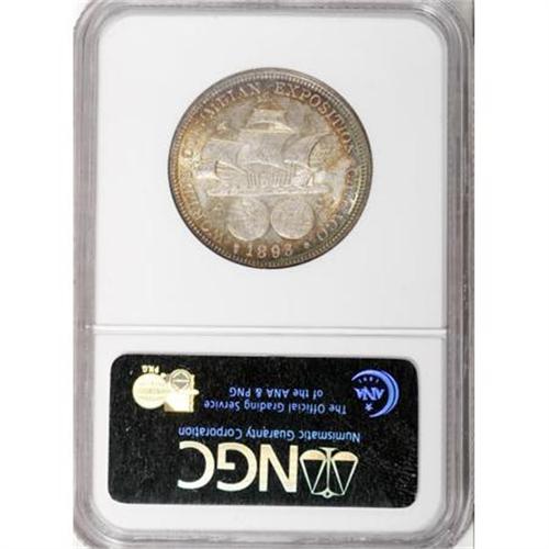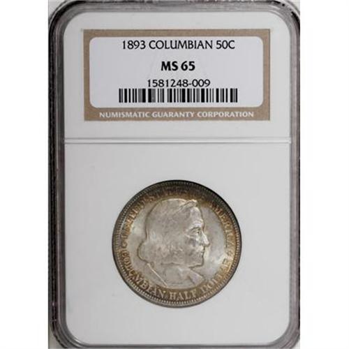 <B>1893 50C Columbian MS65 NGC.</B></I> Peripheral gold and light blue on the obverse with gold, blue, and green on the reverse. This is a splendid Gem with excellent eye appeal.<BR><BR><b>Shipping:</b> Coins & Currency (<a target="_blank" href="http://www.heritageauctions.com/common/shipping.php">view shipping information</a>)