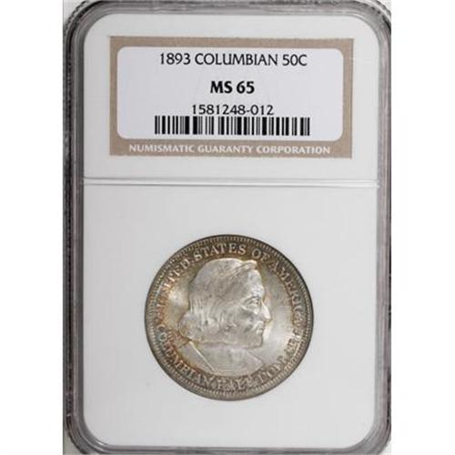 <B>1893 50C Columbian MS65 NGC.</B></I> This splendid Gem has brilliant and frosty luster on the obverse, with attractive peripheral toning. The reverse is mostly golden brown with iridescent accents.<BR><BR><b>Shipping:</b> Coins & Currency (<a target="_blank" href="http://www.heritageauctions.com/common/shipping.php">view shipping information</a>)