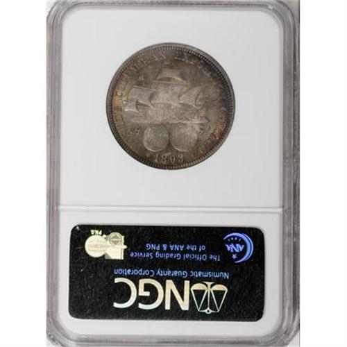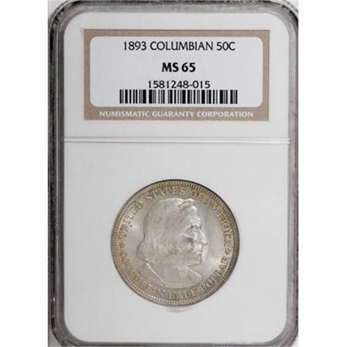 <B>1893 50C Columbian MS65 NGC.</B></I> The obverse of this Gem has fully brilliant silver luster with a hint of gold toning near the border. The reverse is deeply toned with gray-brown luster that is highlighted by subdued gold, russet, and blue.<BR><BR><b>Shipping:</b> Coins & Currency (<a target="_blank" href="http://www.heritageauctions.com/common/shipping.php">view shipping information</a>)