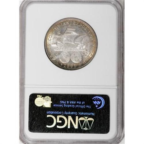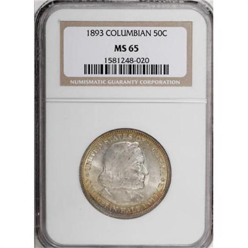 <B>1893 50C Columbian MS65 NGC.</B></I> The obverse and reverse surfaces are mostly brilliant with peripheral gold and sky blue toning on each side.<BR><BR><b>Shipping:</b> Coins & Currency (<a target="_blank" href="http://www.heritageauctions.com/common/shipping.php">view shipping information</a>)