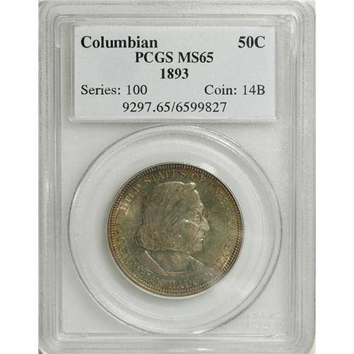 1893 50C Columbian MS65 PCGS. Lustrous surfaces are co