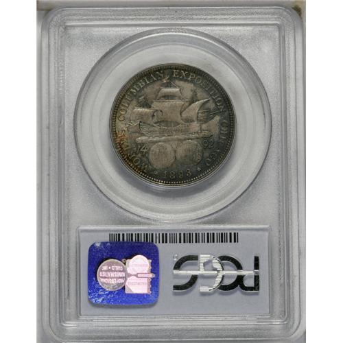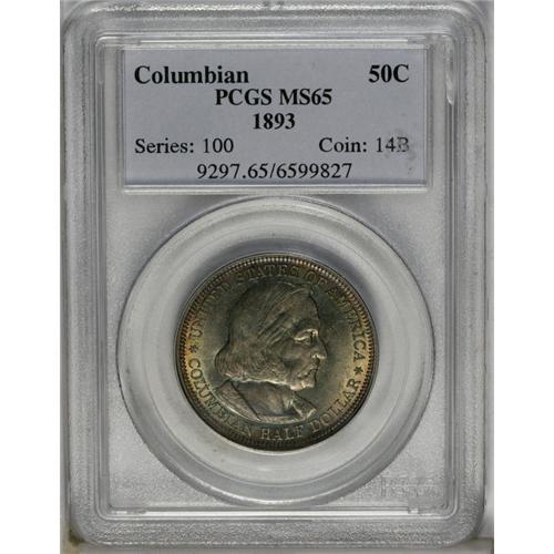 <B>1893<50C> Columbian MS65 PCGS.</B></I> Lustrous with predominantly green-gray toning and occasional peripheral khaki-red. Well struck and attractive with a few small marks that keep this Gem from a higher grade.