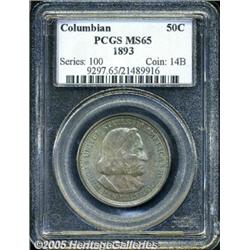 <B>1893 50C Columbian MS65 PCGS.</B></I> This second year of issue has deep olive and blue toning on the obverse with a reverse that has gray patina overall with green marginal accents. Unquestionably original and an important coin for the collector of the 144-piece commemorative set.