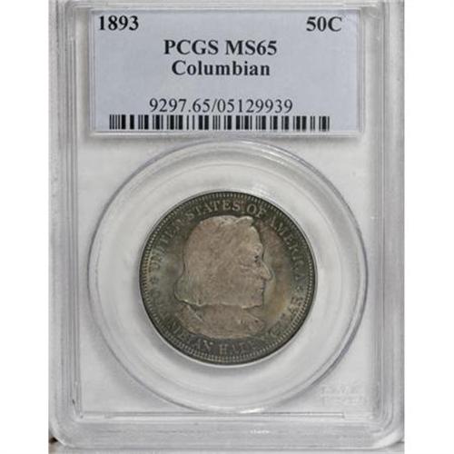 <B>1893 50C Columbian MS65 PCGS.</B></I> PCGS Population (412/143). NGC Census: (605/161). Mintage: 1,550,405. Numismedia Wsl. Price for NGC/PCGS coin in MS65: $765. (#9297)<BR><BR><b>Shipping:</b> Coins & Currency (<a target="_blank" href="http://www.heritageauctions.com/common/shipping.php">view shipping information</a>\)