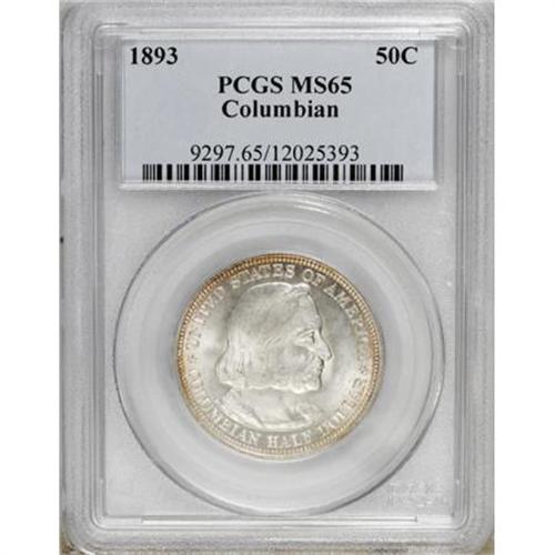<B>1893 50C Columbian MS65 PCGS.</B></I> PCGS Population (433/150). NGC Census: (614/164). Mintage: 1,550,405. Numismedia Wsl. Price for NGC/PCGS coin in MS65: $765. (#9297)<BR><BR><b>Shipping:</b> Coins & Currency (<a target="_blank" href="http://www.heritageauctions.com/common/shipping.php">view shipping information</a>)