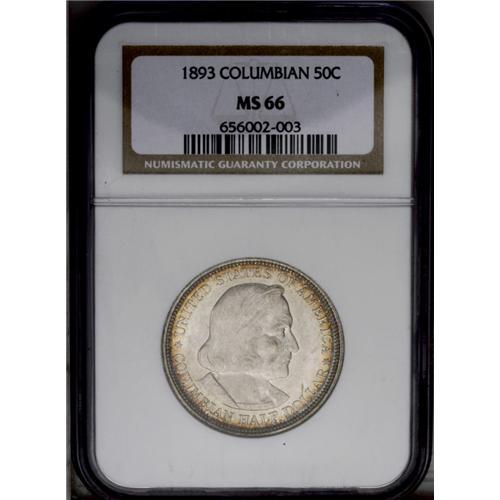 <B>1893<50C> Columbian MS66 NGC.</B></I> Golden-brown and sea-green colors consume the borders, while the radiant centers have pearl-gray color. A splendidly preserved and gorgeous Premium Gem. <BR><BR><B>Important notice:</B> Heritage usually auctions material at the rate of 200-250 lots per hour. On some occasions eBay Live bid software or the Internet may not be able to keep up with the pace of the auction. We recommend placing a realistic absentee bid now as insurance to avoid disappointment. Occasionally the auctioneer may eliminate or reject an eBay Live bid, and the auctioneer may also reopen a lot after the close of the eBay live bidding (usually because we missed an audience bid), and may reject your bid even if it shows you as the winning bidder. By bidding via eBay Live, you agree that Heritage may award the lot to another bidder at its sole discretion under the circumstances described above or any other reasonable circumstances. Since eBay bids are not shown to us until we open the lot on the floor, we treat those bids just like floor bids. In most cases the floor responds before the eBay bid is presented to us, due to Internet lag time, so for consistency we have made it a policy that floor bids are always considered first over tie eBay live bids. Also please note that all Heritage lots purchased through eBay Live carry a 20% Buyer's Premium. Please make sure you read the Terms and Conditions before you bid. This lot is being auctioned in conjunction with a live floor auction by Heritage Galleries & Auctioneers. All final auction and invoice information will be supplied by Heritage Galleries & Auctioneers, and all other information should be considered preliminary. Lot:4922 <BR><BR><B>Winning Notification and Billing:</B> After the FINAL session in this auction is complete, Heritage will send e-mail and snail mail invoices. This process normally takes several days. All final auction and invoice information will be supplied by Heritage Galleries & Auctioneers, and all other information should be considered preliminary. <BR><BR>This auction will be conducted on a live auction floor and over the Internet through eBay Live. If you choose to place an absentee bid, please take a moment to <font color='#0000ff'><u><a href='http://pages.ebay.com/liveauctions/help/before/laabsentee.html'>learn how eBay Live absentee bidding works</a></u></font><font color='#000000'>
