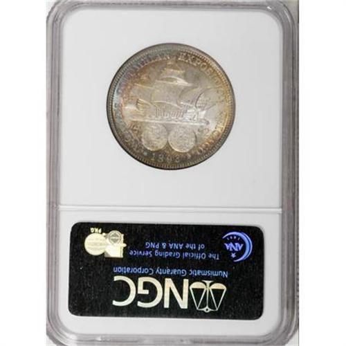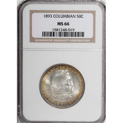 <B>1893 50C Columbian MS66 NGC.</B></I> The central obverse and reverse of this frosty Premium Gem are fully brilliant, surrounded by peripheral gold, russet, and blue toning close to the borders.<BR><BR><b>Shipping:</b> Coins & Currency (<a target="_blank" href="http://www.heritageauctions.com/common/shipping.php">view shipping information</a>)