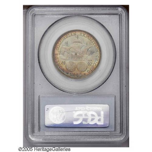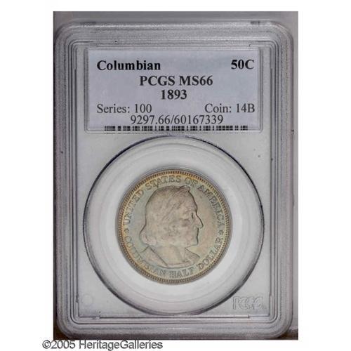<B>1893<50C> Columbian MS66 PCGS.</B></I> Iridescent violet and blue hues permeate the satiny, lustrous surfaces on this second year issue.