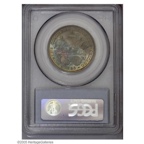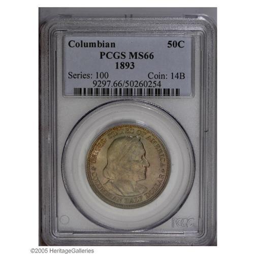 <B>1893<50C> Columbian MS66 PCGS.</B></I> Stunning in it's color and originality, this piece is also well struck for a normally poorly produced issue. The obverse is fully lustrous beneath sea-green toning while the reverse is bathed in shades of sea-green, gold, and steel-blue colors.