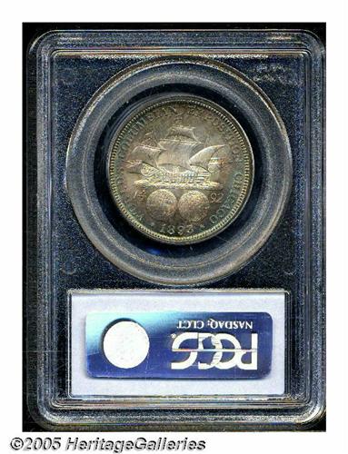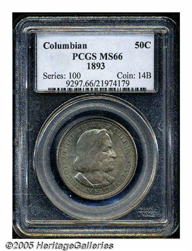 <B>1893<50C> Columbian MS66 PCGS.</B></I> Superb-Gem example of this early commemorative issue with nice luster and a mixture of attractive blue, green, crimson and violet colors. A small luster mark on the left globe is noted for accuracy.