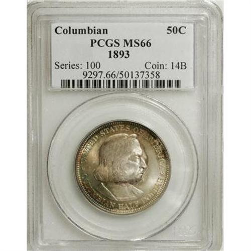 <B>1893 50C Columbian MS66 PCGS.</B></I> PCGS Population (141/7). NGC Census: (135/27). Mintage: 1,550,405. Numismedia Wsl. Price for NGC/PCGS coin in MS66: $1,725. (#9297)<BR><BR><b>Shipping:</b> Coins & Currency (<a target="_blank" href="http://www.heritageauctions.com/common/shipping.php">view shipping information</a>\)