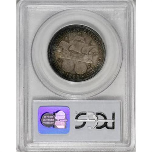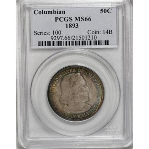 <B>1893 50C Columbian MS66 PCGS.</B></I> Columbian halves have a distinctive palette of colors. They are usually seen with gray-blue centers and iridescently toned peripheries, as seen on this piece. This large-production second year of issue has strong mint luster and there are no noticeable marks on either side.<BR><BR><b>Shipping:</b> Coins & Currency (<a target="_blank" href="http://www.heritageauctions.com/common/shipping.php">view shipping information</a>)