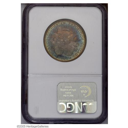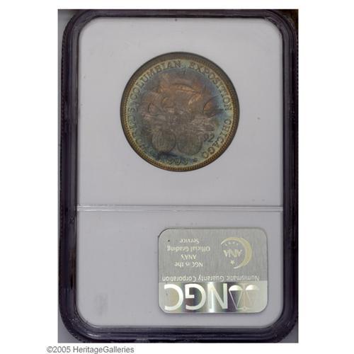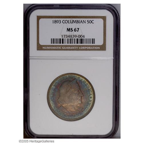 <B>1893<50C> Columbian MS67 NGC.</B></I> A highly attractive Superb Gem example with gorgeous rose, turquoise, and bright blue color on both sides. The date and some of the lettering on the reverse are lightly doubled, a form of double striking known as machine doubling. This is not a doubled die variety. This example has few peers, as suggested by the current population data. Population: 16 in 67, 1 finer (10/05).