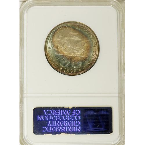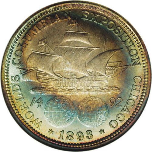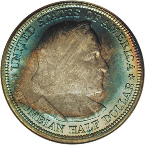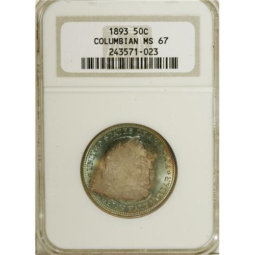 <B>1893 50C Columbian MS67 NGC.</B></I> The 1892 and 1893 Columbian halves were trendsetters, and not just as the first of their kind; they provoked controversy over their shared design, and both were over-minted to the point that many examples found circulation. Few examples of this high-mintage issue have such striking visual appeal as the present piece. Soft steel-gray and golden toning splashes across the centers, while vivid blue-green patina graces the flashy outer regions. NGC notes just two numerically finer representatives (3/07).<BR><I>From The Cary & Cheryl Porter Collection.</B></I><BR><BR><b>Shipping:</b> Coins & Currency (<a target="_blank" href="http://www.heritageauctions.com/common/shipping.php">view shipping information</a>)