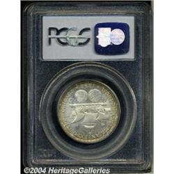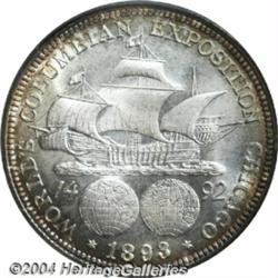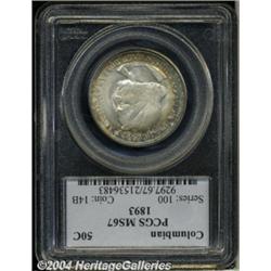 <B>1893<50C> Columbian MS67 PCGS.</B></I> The obverse features a dove-gray center that is framed with magnificent iridescent toning, in vivid shades of cobalt-blue, green, and antique reddish-golden colors. The reverse is somewhat lighter with medium red-golden color about the border. The strike is good, and strong, frosty luster swirls about the rainbow colors. The surfaces are amazingly free of distracting abrasions for this often-abused Columbian issue, having only a few trivial field ticks that are more than compensated for by the gorgeous toning. Unavailable any finer. Population: 5 in 67, 0 finer (3/04). <BR><BR><B>Important notice:</B> Heritage usually auctions material at the rate of 200-250 lots per hour. On some occasions eBay Live bid software or the Internet may not be able to keep up with the pace of the auction. We recommend placing a realistic absentee bid now as insurance to avoid disappointment. Occasionally the auctioneer may eliminate or reject an eBay Live bid, and the auctioneer may also reopen a lot after the close of the eBay live bidding (usually because we missed an audience bid), and may reject your bid even if it shows you as the winning bidder. By bidding via eBay Live, you agree that Heritage may award the lot to another bidder at its sole discretion under the circumstances described above or any other reasonable circumstances. Since eBay bids are not shown to us until we open the lot on the floor, we treat those bids just like floor bids. In most cases the floor responds before the eBay bid is presented to us, due to Internet lag time, so for consistency we have made it a policy that floor bids are always considered first over tie eBay live bids. Also please note that all Heritage lots purchased through eBay Live carry a 20% Buyer's Premium. Please make sure you read the Terms and Conditions before you bid. </span></font></tr></table></td></tr></table>