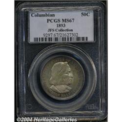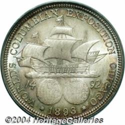 <B>1893<50C> Columbian MS67 PCGS.</B></I> This is a beautifully and originally toned Superb Gem. Dominant mint-green and gray shadings yield to deeper gunmetal-blue, apricot, and gold undertones in a rainbow fashion as the surfaces rotate under the light. There are no grade-limiting abrasions (either apparent or concealed), and the eye appeal is extraordinary in all regards. Well struck throughout with sharp rigging under the sails, only a couple of minor marks are noted. Population: 5 in 67, 0 finer (6/04).<BR><I>Ex: FUN Signature Sale (Heritage, 1/03), lot 9627, which realized $14,950.</B></I><BR><I>From the JFS Collection, the #1 All-Time PCGS Registry Set.</B></I> <BR><BR><B>Important notice:</B> Heritage usually auctions material at the rate of 200-250 lots per hour. On some occasions eBay Live bid software or the Internet may not be able to keep up with the pace of the auction. We recommend placing a realistic absentee bid now as insurance to avoid disappointment. Occasionally the auctioneer may eliminate or reject an eBay Live bid, and the auctioneer may also reopen a lot after the close of the eBay live bidding (usually because we missed an audience bid), and may reject your bid even if it shows you as the winning bidder. By bidding via eBay Live, you agree that Heritage may award the lot to another bidder at its sole discretion under the circumstances described above or any other reasonable circumstances. Since eBay bids are not shown to us until we open the lot on the floor, we treat those bids just like floor bids. In most cases the floor responds before the eBay bid is presented to us, due to Internet lag time, so for consistency we have made it a policy that floor bids are always considered first over tie eBay live bids. Also please note that all Heritage lots purchased through eBay Live carry a 20% Buyer's Premium. Please make sure you read the Terms and Conditions before you bid. </span></font></tr></table></td></tr></table>
