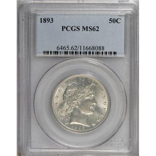 <B>1893 50C MS62 PCGS.</B></I> Satiny luster adorns essentially untoned surfaces on this second year Barber half, and a sharp strike nicely defines the design elements. Light contact marks are visible on the cheek and neck.<BR><BR><B>Coin Engraver:</B> Charles E. Barber<BR><BR><b>Shipping:</b> Coins & Currency (<a target="_blank" href="http://www.heritageauctions.com/common/shipping.php">view shipping information</a>)