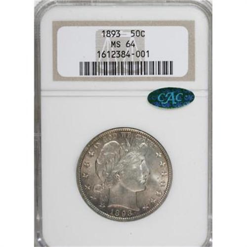 <B>1893 50C MS64 NGC. CAC.</B></I> This delightful coin is close to a full strike, save for trivial weakness on the right shield corner. The coloration is beautiful, with brilliant silver centers melding into pinkish-gold and magenta at the rims. There are a couple of ticks on the cheek that appear to limit the grade, but the small depression in the center of the cheek appears to be a mint-made planchet lamination. Those are minor quibbles, however, and this remains a wonderful coin for the issue. Census: 27 in 64, 15 finer (1/08).<BR><I>From The Southwest Collection.</B></I><BR><BR><B>Coin Engraver:</B> Charles E. Barber<BR><BR><b>Shipping:</b> Coins & Currency (<a target="_blank" href="http://www.heritageauctions.com/common/shipping.php">view shipping information</a>)