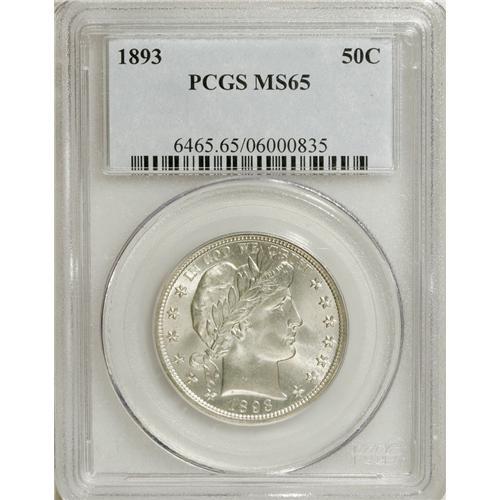 <B>1893 50C MS65 PCGS.</B></I> This early-issue Barber half comes from a mintage of 1,826,000 circulation strikes, and while fairly tough in low grades, is slightly more available in About Uncirculated condition and above (David Lawrence, 1991). MS65 and finer examples are somewhat more elusive. The MS65 piece in the current lot is brilliant, or nearly so, and exhibits radiant luster. The design elements are sharply delineated throughout. A few minuscule marks prevent the next highest grade. A super coin in all respects! Population: 13 in 65, 11 finer (3/07).<BR><BR><b>Shipping:</b> Coins & Currency (<a target="_blank" href="http://www.heritageauctions.com/common/shipping.php">view shipping information</a>)
