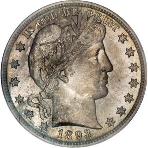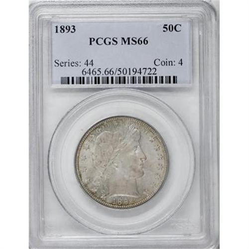 <B>1893 50C MS66 PCGS.</B></I> The sharply defined surfaces are thickly frosted and are almost free from even the tiniest abrasions. Both sides have a silver-gray appearance, and display touches of aqua, beige, and gold in selected areas. The 1893 is scarce but collectible in Mint State. Most Uncirculated examples are found between MS62 and MS64. Premium Gems are both rare and desirable. Population: 11 in 66, 0 finer (11/07).<BR><BR><B>Coin Engraver:</B> Charles E. Barber<BR><BR><b>Shipping:</b> Coins & Currency (<a target="_blank" href="http://www.heritageauctions.com/common/shipping.php">view shipping information</a>)