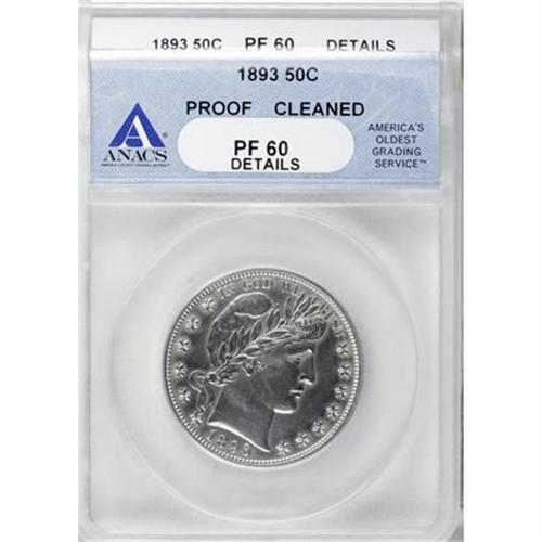 <B>1893 50C --Cleaned--ANACS. PF60 Details.</B></I> NGC Census: (2/184). PCGS Population (4/177). Mintage: 792. Numismedia Wsl. Price for NGC/PCGS coin in PR60: $425. (#6540)<BR><BR><B>Coin Engraver:</B> Charles E. Barber<BR><BR><b>Shipping:</b> Coins & Currency (<a target="_blank" href="http://www.heritageauctions.com/common/shipping.php">view shipping information</a>)