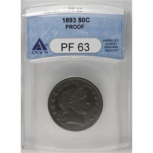 <B>1893<50C> PR63 ANACS.</B></I> A sharply struck proof although the surfaces are subdued by deep gunmetal toning on both sides.