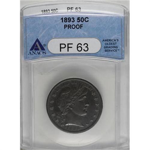 <B>1893 50C PR63 ANACS.</B></I> NGC Census: (44/123). PCGS Population (44/103). Mintage: 792. Numismedia Wsl. Price for NGC/PCGS coin in PR63: $765. (#6540)<BR><BR><B>Coin Engraver:</B> Charles E. Barber<BR><BR><b>Shipping:</b> Coins & Currency (<a target="_blank" href="http://www.heritageauctions.com/common/shipping.php">view shipping information</a>)