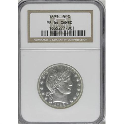 <B>1893 50C PR64 Cameo NGC.</B></I> Both sides of this near-Gem offer distinct contrast, though the reverse devices show richer frost. The slightly hazy fields show a few faint hairlines that account for the grade. Census: 20 in 64 Cameo, 36 finer (12/07).<BR><BR><b>Shipping:</b> Coins & Currency (<a target="_blank" href="http://www.heritageauctions.com/common/shipping.php">view shipping information</a>)