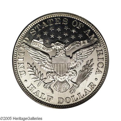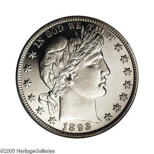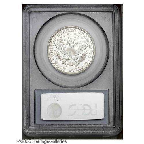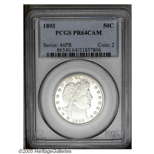 <B>1893<50C> PR64 Cameo PCGS.</B></I> Only 793 proof halves were struck in 1893. This piece displays outstanding cameo contrast; the white motifs appear to float over the glassy fields. The design elements are sharply impressed, except for the upper right (facing) corner of the shield. Light contact marks on Liberty's cheek and neck preclude a higher grade. Population: 10 in 64, 21 finer (12/05).