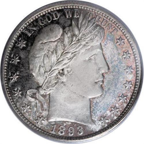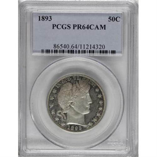 <B>1893 50C PR64 Cameo PCGS.</B></I> Choice and attractive, one of 792 proofs coined of this early issue. Unlike most Barber pieces of the 20th century, 19th century coins often have frosted devices, a carryover from the days of Seated coinage, and the result was a significant population of specimens with a cameo effect. One such piece is offered here. Liberty's head and the eagle are largely silver-gray with distinct texture, while the fields have ample russet and sky-blue toning and reflectivity beneath. Minor contact on the obverse accounts for the grade. Population: 12 in 64 Cameo, 25 finer (11/07).<BR><BR><b>Shipping:</b> Coins & Currency (<a target="_blank" href="http://www.heritageauctions.com/common/shipping.php">view shipping information</a>)