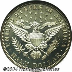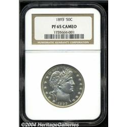 <B>1893<50C> PR65 Cameo NGC.</B></I> The surfaces on this gorgeous Barber half dollar cameo proof are exceptionally well preserved, with only Liberty's face and neck showing a few unobtrusive ticks. Just the slightest hint of incipient, faint gold color is evident over each side. The design elements are well struck, with the exception of a small area of weakness on the upper right corner of the shield and the adjacent left wing of the eagle. The reflective fields establish a noticeable cameo contrast with the main devices on this exceptional coin. Population: 6 in 65, 16 finer (5/04). <BR><BR><B>Important notice:</B> Heritage usually auctions material at the rate of 200-250 lots per hour. On some occasions eBay Live bid software or the Internet may not be able to keep up with the pace of the auction. We recommend placing a realistic absentee bid now as insurance to avoid disappointment. Occasionally the auctioneer may eliminate or reject an eBay Live bid, and the auctioneer may also reopen a lot after the close of the eBay live bidding (usually because we missed an audience bid), and may reject your bid even if it shows you as the winning bidder. By bidding via eBay Live, you agree that Heritage may award the lot to another bidder at its sole discretion under the circumstances described above or any other reasonable circumstances. Since eBay bids are not shown to us until we open the lot on the floor, we treat those bids just like floor bids. In most cases the floor responds before the eBay bid is presented to us, due to Internet lag time, so for consistency we have made it a policy that floor bids are always considered first over tie eBay live bids. Also please note that all Heritage lots purchased through eBay Live carry a 20% Buyer's Premium. Please make sure you read the Terms and Conditions before you bid. </span></font></tr></table></td></tr></table>
