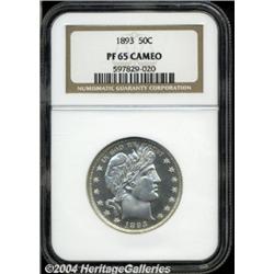 <B>1893<50C> PR65 Cameo NGC.</B></I> A couple touches of color are noted on otherwise untoned, virtually blemish free surfaces. Nicely cameoed, with boldly impressed design elements. Population: 7 in 65, 15 finer (7/04). <BR><BR><B>Important notice:</B> Heritage usually auctions material at the rate of 200-250 lots per hour. On some occasions eBay Live bid software or the Internet may not be able to keep up with the pace of the auction. We recommend placing a realistic absentee bid now as insurance to avoid disappointment. Occasionally the auctioneer may eliminate or reject an eBay Live bid, and the auctioneer may also reopen a lot after the close of the eBay live bidding (usually because we missed an audience bid), and may reject your bid even if it shows you as the winning bidder. By bidding via eBay Live, you agree that Heritage may award the lot to another bidder at its sole discretion under the circumstances described above or any other reasonable circumstances. Since eBay bids are not shown to us until we open the lot on the floor, we treat those bids just like floor bids. In most cases the floor responds before the eBay bid is presented to us, due to Internet lag time, so for consistency we have made it a policy that floor bids are always considered first over tie eBay live bids. Also please note that all Heritage lots purchased through eBay Live carry a 20% Buyer's Premium. Please make sure you read the Terms and Conditions before you bid. </span></font></tr></table></td></tr></table>