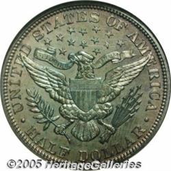 <B>1893 50C PR65 NGC.</B></I> Pastel coral-red and sea-green colors compete for territory on this carefully preserved proof Half Dollar. The fletchings and claws are fully struck, while the right shield corner has only a hint of softness. The second year of the Barber type apparently did not inspire collectors of the day, since the mintage of 792 proofs is much smaller than the introductory 1892 issue.