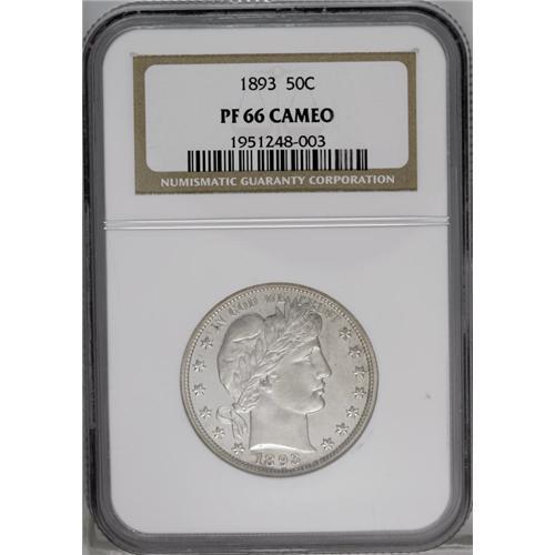 <B>1893<50C> PR66 Cameo NGC.</B></I> Essentially untoned with stark field-to-device contrast. Only a few tiny frost breaks on the cheek appear to stand in the way of Superb quality. Census: 12 in 66 Cameo, 11 finer (3/06). <BR><BR><B>Important notice:</B> Heritage usually auctions material at the rate of 200-250 lots per hour. On some occasions eBay Live bid software or the Internet may not be able to keep up with the pace of the auction. We recommend placing a realistic absentee bid now as insurance to avoid disappointment. Occasionally the auctioneer may eliminate or reject an eBay Live bid, and the auctioneer may also reopen a lot after the close of the eBay live bidding (usually because we missed an audience bid), and may reject your bid even if it shows you as the winning bidder. By bidding via eBay Live, you agree that Heritage may award the lot to another bidder at its sole discretion under the circumstances described above or any other reasonable circumstances. Since eBay bids are not shown to us until we open the lot on the floor, we treat those bids just like floor bids. In most cases the floor responds before the eBay bid is presented to us, due to Internet lag time, so for consistency we have made it a policy that floor bids are always considered first over tie eBay live bids. Also please note that all Heritage lots purchased through eBay Live carry a 20% Buyer's Premium. Please make sure you read the Terms and Conditions before you bid. This lot is being auctioned in conjunction with a live floor auction by Heritage Galleries & Auctioneers. All final auction and invoice information will be supplied by Heritage Galleries & Auctioneers, and all other information should be considered preliminary. Lot:2083 <BR><BR><B>Winning Notification and Billing:</B> After the FINAL session in this auction is complete, Heritage will send e-mail and snail mail invoices. This process normally takes several days. All final auction and invoice information will be supplied by Heritage Galleries & Auctioneers, and all other information should be considered preliminary. <BR><BR>This auction will be conducted on a live auction floor and over the Internet through eBay Live. If you choose to place an absentee bid, please take a moment to <font color='#0000ff'><u><a href='http://pages.ebay.com/liveauctions/help/before/laabsentee.html'>learn how eBay Live absentee bidding works</a></u></font><font color='#000000'>