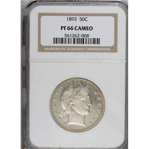 <B>1893 50C PR66 Cameo NGC.</B></I> A well-executed strike emboldens the design elements, and a few barely discernible speckles of pale mauve give way to occasional slivers of gold toning around the rims. The field-motif contrast is undeniable. Much scarcer than the first year 1892 proof. Census: 13 in 66 Cameo, 14 finer (11/07).<BR><BR><b>Shipping:</b> Coins & Currency (<a target="_blank" href="http://www.heritageauctions.com/common/shipping.php">view shipping information</a>)