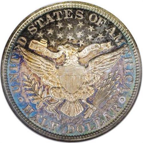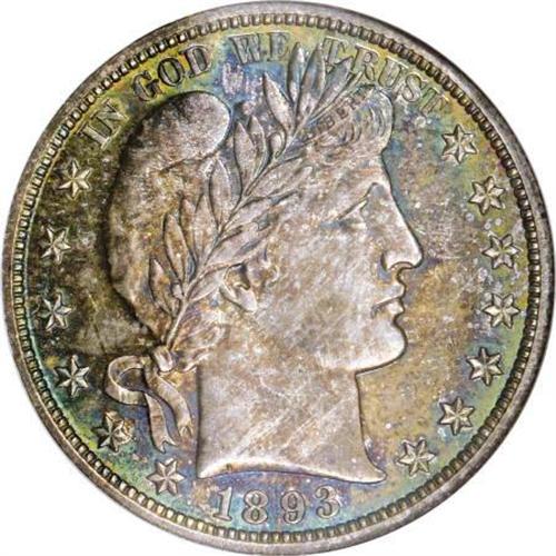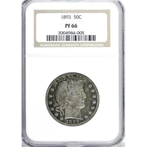 <B>1893 50C PR66 NGC.</B></I> Interest in Barber proofs fell off rapidly, and the 1,245 specimens struck in 1892 plunged to 792 halves for the next year. This decisively struck piece offers considerable reflectivity beneath the vivid rose, gold, and powder-blue patina that drapes each side. Beautifully preserved. Census: 29 in 66, 20 finer (10/07).<BR><BR><B>Coin Engraver:</B> Charles E. Barber<BR><BR><b>Shipping:</b> Coins & Currency (<a target="_blank" href="http://www.heritageauctions.com/common/shipping.php">view shipping information</a>)