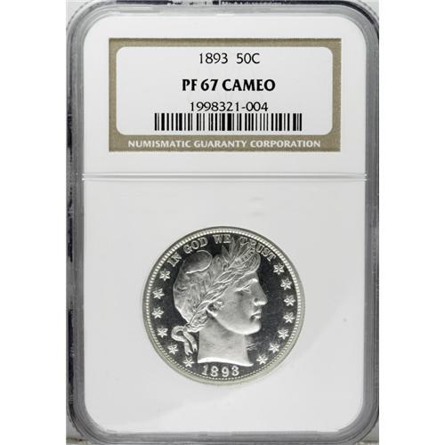<B>1893 50C PR67 Cameo NGC.</B></I> A powerful strike has left its imprint on the frosted design elements, further enhancing the fabulous eye appeal of this Superb Proof Cameo. Full brilliance is noted on both sides, as are impeccably cared for surfaces. A few insignificant handling marks on Liberty's cheek and neck do not detract in the least. Census: 12 in 67 Cameo, 2 finer (12/06).<BR><BR><b>Shipping:</b> Coins & Currency (<a target="_blank" href="http://www.heritageauctions.com/common/shipping.php">view shipping information</a>)