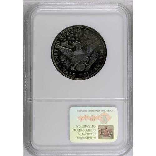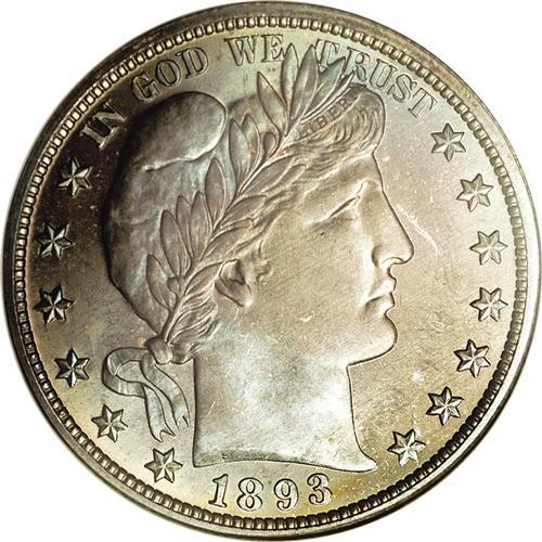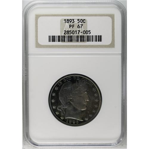 <B>1893<50C> PR67 NGC.</B></I> A truly superlative example that displays exquisite, original toning on both sides in shades of gunmetal-blue, cobalt-blue, gold, and tan. The deeply mirrored surfaces appear to be totally free of any distracting hairlines or any imperfections at all, just what one might expect from a PR67 specimen. It would be hard to imagine a finer appearing example. Census: 17 in 67, 4 finer (6/06).<BR><I>From The Belle Glade Collection.</B></I> <BR><BR><B>Importa