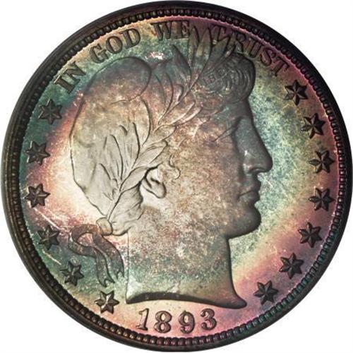 <B>1893 50C PR68 PCGS. CAC.</B></I> A stunning and vibrantly toned Superb Gem, with silver-white at the center, surrounded by sea-green, amber, lavender, and sky-blue toning. The reverse has a similar appearance, but lacking the white center. Every detail is particularly bold and fully defined, as usual. Few examples have such an amazing physical presentation, such pieces surviving from decades old collections. The modest mintage of 792 coins includes coins distributed to advanced coin collectors and others in the 1890s. Survival of silver proofs from this time period numbers about half the original mintage, perhaps providing a clue about the number of collectors that were active at the time.<BR><BR><B>Coin Engraver:</B> Charles E. Barber<BR><BR><b>Shipping:</b> Coins & Currency (<a target="_blank" href="http://www.heritageauctions.com/common/shipping.php">view shipping information</a>)