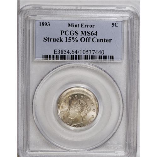 1893 5C Liberty Nickel--Struck 15% Off Center--MS64 PC