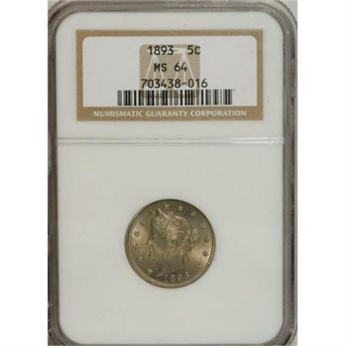 <B>1893 5C MS64 NGC.</B></I> NGC Census: (148/75). PCGS Population (165/81). Mintage: 13,370,195. Numismedia Wsl. Price for NGC/PCGS coin in MS64: $240. (#3854)<BR><BR><B>Coin Engraver:</B> Charles E. Barber<BR><BR><b>Shipping:</b> Coins & Currency (<a target="_blank" href="http://www.heritageauctions.com/common/shipping.php">view shipping information</a>)