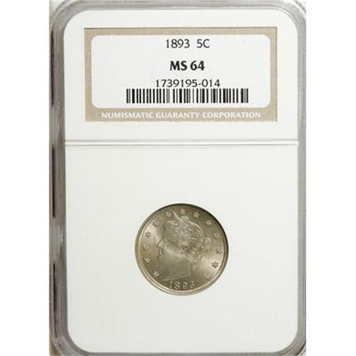 <B>1893 5C MS64 NGC.</B></I> NGC Census: (153/78). PCGS Population (173/82). Mintage: 13,370,195. Numismedia Wsl. Price for NGC/PCGS coin in MS64: $240. (#3854)<BR><BR><B>Coin Engraver:</B> Charles E. Barber<BR><BR><b>Shipping:</b> Coins & Currency (<a target="_blank" href="http://www.heritageauctions.com/common/shipping.php">view shipping information</a>)