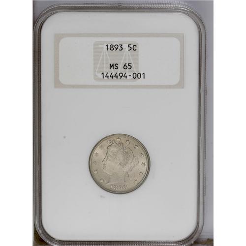 <B>1893<5C> MS65 NGC.</B></I> A lustrous tan-gray Gem with pleasing preservation. The left ear of corn is indifferently struck, but most design details are sharp. Housed in a prior generation NGC holder. Census: 67 in 65, 9 finer (3/06). <BR><BR><B>Important notice:</B> Heritage usually auctions material at the rate of 200-250 lots per hour. On some occasions eBay Live bid software or the Internet may not be able to keep up with the pace of the auction. We recommend placing a realistic absentee bid now as insurance to avoid disappointment. Occasionally the auctioneer may eliminate or reject an eBay Live bid, and the auctioneer may also reopen a lot after the close of the eBay live bidding (usually because we missed an audience bid), and may reject your bid even if it shows you as the winning bidder. By bidding via eBay Live, you agree that Heritage may award the lot to another bidder at its sole discretion under the circumstances described above or any other reasonable circumstances. Since eBay bids are not shown to us until we open the lot on the floor, we treat those bids just like floor bids. In most cases the floor responds before the eBay bid is presented to us, due to Internet lag time, so for consistency we have made it a policy that floor bids are always considered first over tie eBay live bids. Also please note that all Heritage lots purchased through eBay Live carry a 20% Buyer's Premium. Please make sure you read the Terms and Conditions before you bid. This lot is being auctioned in conjunction with a live floor auction by Heritage Galleries & Auctioneers. All final auction and invoice information will be supplied by Heritage Galleries & Auctioneers, and all other information should be considered preliminary. Lot:928 <BR><BR><B>Winning Notification and Billing:</B> After the FINAL session in this auction is complete, Heritage will send e-mail and snail mail invoices. This process normally takes several days. All final auction and invoice information will be supplied by Heritage Galleries & Auctioneers, and all other information should be considered preliminary. <BR><BR>This auction will be conducted on a live auction floor and over the Internet through eBay Live. If you choose to place an absentee bid, please take a moment to <font color='#0000ff'><u><a href='http://pages.ebay.com/liveauctions/help/before/laabsentee.html'>learn how eBay Live absentee bidding works</a></u></font><font color='#000000'>