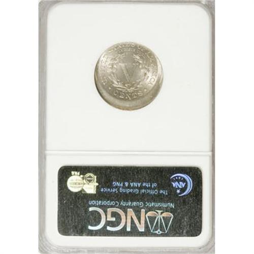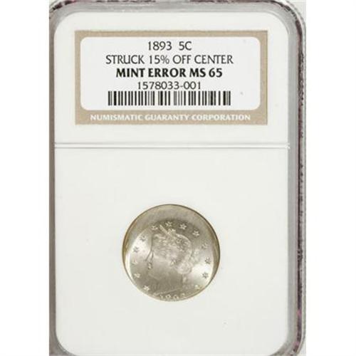 <B>1893 5C Liberty Nickel--Struck 15% Off Center--NGC. MS65.</B></I> Struck off-center at 6 o'clock with the tops of the date visible, clearly enough for identification. This incredible error is sharply defined with frosty nickel-gray surfaces and a trace of light gold toning near the borders.<BR><BR><B>Coin Engraver:</B> Charles E. Barber<BR><BR><b>Shipping:</b> Coins & Currency (<a target="_blank" href="http://www.heritageauctions.com/common/shipping.php">view shipping information</a>)
