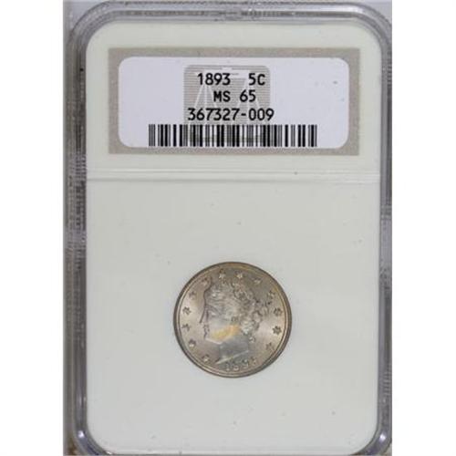 <B>1893 5C MS65 NGC.</B></I> An attractive Gem example of this mid-date issue, well-defined in the centers with a measure of softness on the stars and wreath. Delicate peach and blue toning visits the centers, while the obverse has a daub of green-gold along the jawline. NGC has graded seven finer pieces (10/07).<BR><BR><B>Coin Engraver:</B> Charles E. Barber<BR><BR><b>Shipping:</b> Coins & Currency (<a target="_blank" href="http://www.heritageauctions.com/common/shipping.php">view shipping information</a>)