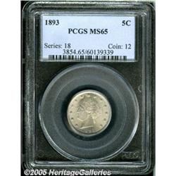 <B>1893 5C MS65 PCGS.</B></I> Potent luster and clean surfaces confirm the lofty grade of this lovely Gem. The uppermost star and the left ear of corn are not completely brought up by the dies, however, Liberty's hair is sharp. Population: 44 in 65, 5 finer (2/05).<BR><I>From The Napa Valley Collection.</B></I>