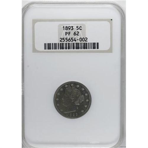 <B>1893 5C PR62 NGC.</B></I> NGC Census: (12/295). PCGS Population (20/387). Mintage: 2,195. Numismedia Wsl. Price for NGC/PCGS coin in PR62: $146. (#3891)<BR><BR><B>Coin Engraver:</B> Charles E. Barber<BR><BR><b>Shipping:</b> Coins & Currency (<a target="_blank" href="http://www.heritageauctions.com/common/shipping.php">view shipping information</a>)