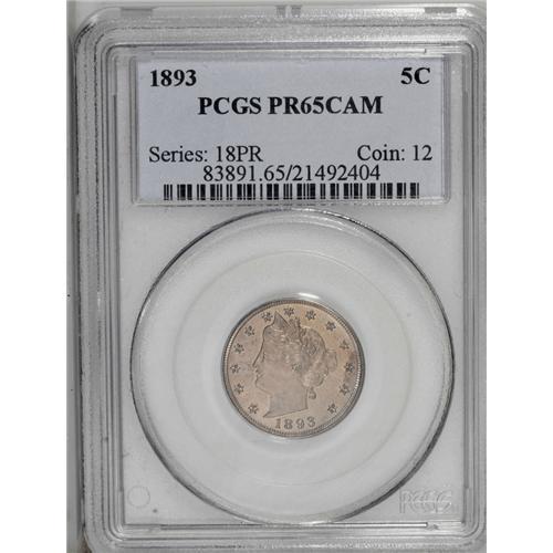 <B>1893<5C> PR65 Cameo PCGS.</B></I> Delicate gold toning adorns both sides of this remarkably well-preserved Gem. A deeply reflective piece with pleasing contrast. Population: 14 in 65 Cameo, 18 finer (8/06).