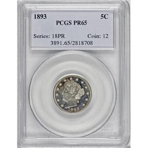 <B>1893 5C PR65 PCGS.</B></I> PCGS Population (85/25). NGC Census: (107/46). Mintage: 2,195. Numismedia Wsl. Price for NGC/PCGS coin in PR65: $490. (#3891)<BR><BR><B>Coin Engraver:</B> Charles E. Barber<BR><BR><b>Shipping:</b> Coins & Currency (<a target="_blank" href="http://www.heritageauctions.com/common/shipping.php">view shipping information</a>)