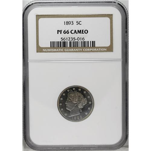 <B>1893<5C> PR66 Cameo NGC.</B></I> An attractive melange of pastel powder-blue and gold-beige patina overlays each side. The design features are exquisitely well brought up. A couple of minute marks on the cheek and neck are mentioned for accuracy. Census: 20 in 66, 4 finer (3/06). <BR><BR><B>Important notice:</B> Heritage usually auctions material at the rate of 200-250 lots per hour. On some occasions eBay Live bid software or the Internet may not be able to keep up with the pace of the auction. We recommend placing a realistic absentee bid now as insurance to avoid disappointment. Occasionally the auctioneer may eliminate or reject an eBay Live bid, and the auctioneer may also reopen a lot after the close of the eBay live bidding (usually because we missed an audience bid), and may reject your bid even if it shows you as the winning bidder. By bidding via eBay Live, you agree that Heritage may award the lot to another bidder at its sole discretion under the circumstances described above or any other reasonable circumstances. Since eBay bids are not shown to us until we open the lot on the floor, we treat those bids just like floor bids. In most cases the floor responds before the eBay bid is presented to us, due to Internet lag time, so for consistency we have made it a policy that floor bids are always considered first over tie eBay live bids. Also please note that all Heritage lots purchased through eBay Live carry a 20% Buyer's Premium. Please make sure you read the Terms and Conditions before you bid. This lot is being auctioned in conjunction with a live floor auction by Heritage Galleries & Auctioneers. All final auction and invoice information will be supplied by Heritage Galleries & Auctioneers, and all other information should be considered preliminary. Lot:1001 <BR><BR><B>Winning Notification and Billing:</B> After the FINAL session in this auction is complete, Heritage will send e-mail and snail mail invoices. This process normally takes several days. All final auction and invoice information will be supplied by Heritage Galleries & Auctioneers, and all other information should be considered preliminary. <BR><BR>This auction will be conducted on a live auction floor and over the Internet through eBay Live. If you choose to place an absentee bid, please take a moment to <font color='#0000ff'><u><a href='http://pages.ebay.com/liveauctions/help/before/laabsentee.html'>learn how eBay Live absentee bidding works</a></u></font><font color='#000000'>